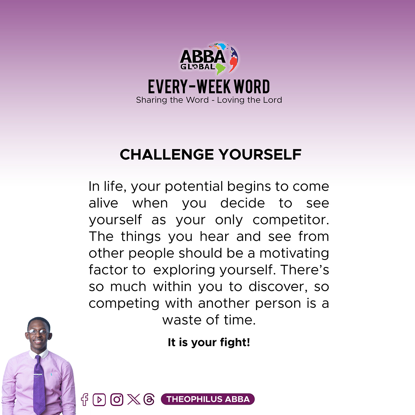 My dear friends, one of the easiest ways to lose track of your life adventure is to compare yourself with another person. Even twins don't run the same race. I want to challenge you to challenge yourself in this season to maximize yourself. One of the reasons why you should not compare yourself with others is because the conditions that are situated with your neighbor's race are different from your race.